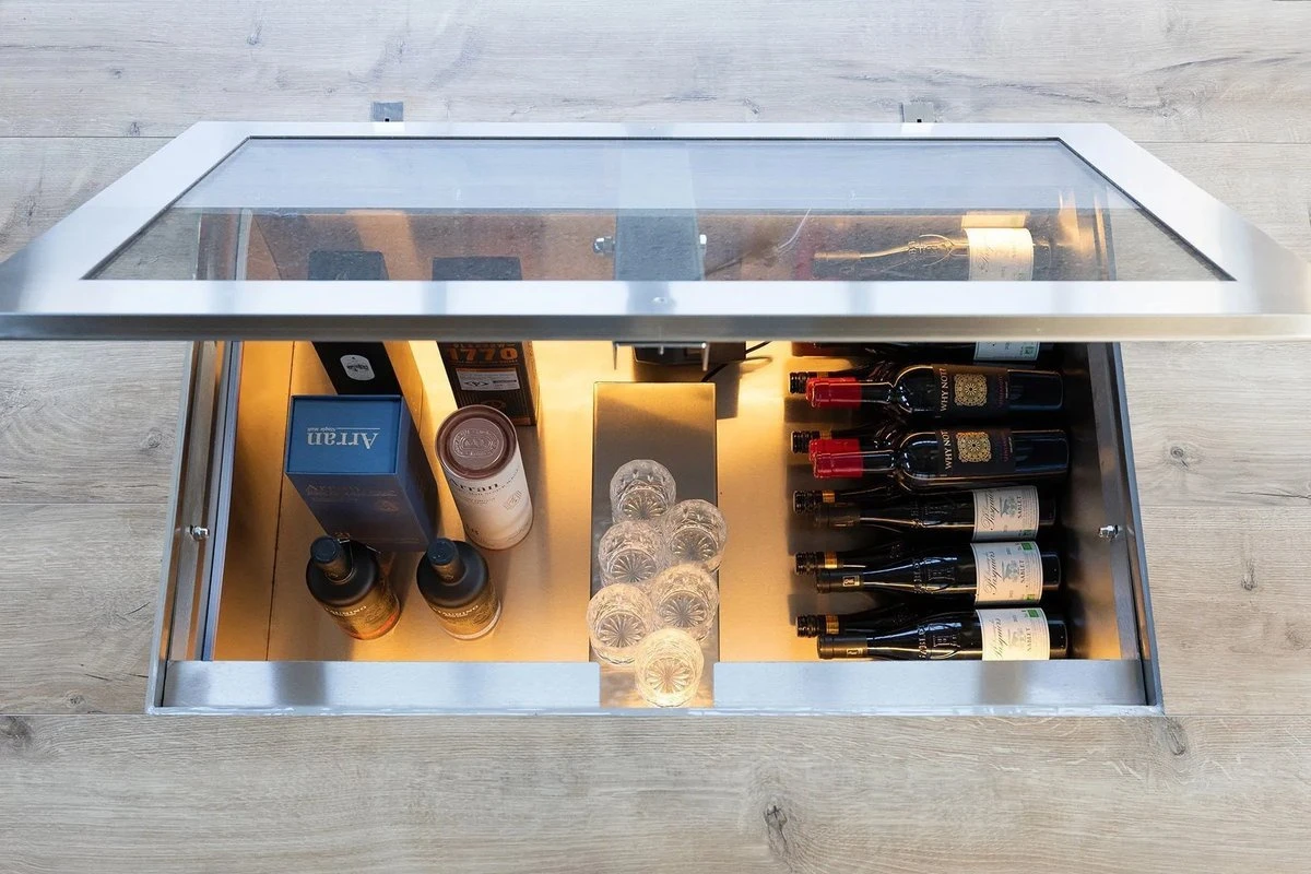 Den diskrete placering sparer plads og giver et moderne udtryk. Du kan fremvise din vinsamling gennem en stilfuld glaslåge – en både praktisk og luksuriøs detalje i rummet.